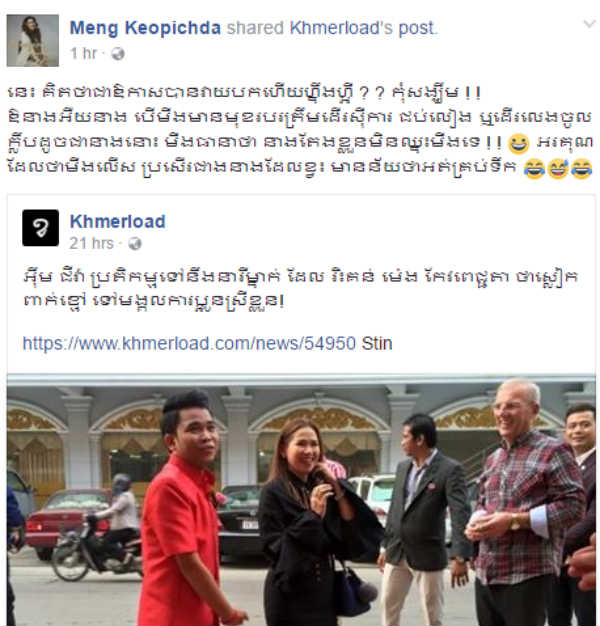 ភ្នំពេញ៖ បន្ទាប់ពីនារីម្ចាស់ Account Facebook ម្នាក់ ដែលមានឈ្មោះថា Sesamuth Dalyda Real ម្នាក់បានសម្តែងចេញនូវភាពមិនពេញចិត្ត ទៅលើការស្លៀកពាក់តែងខ្លួនរបស់ តារាចម្រៀងស្រីចាស់វស្សា អ្នកនាង ម៉េង កែវពេជ្ជតានោះ ពេលនេះលទ្ធផលបានចេញមកជាផ្លែផ្កាហើយ គឺអ្នកនាង ម៉េង កែវពេជ្ជតា បានដាក់សារឆ្លើយតបមកវិញយ៉ាងគាប់ចិត្ត ព្រោះមិនអាចនៅស្ងៀមទ្រាំគេរិះគន់ខ្លួននៅនឹងមុខនឹងមាត់ដូច្នេះបាន។